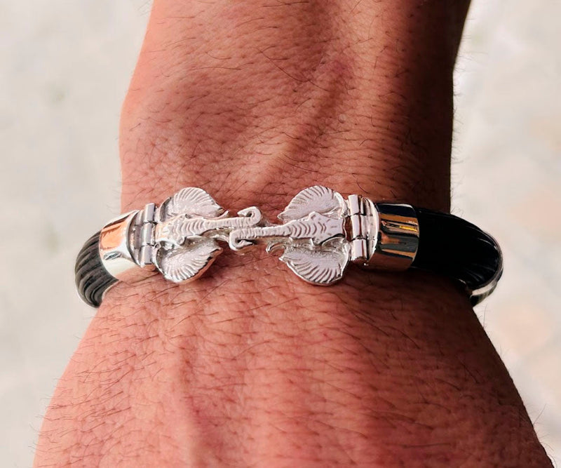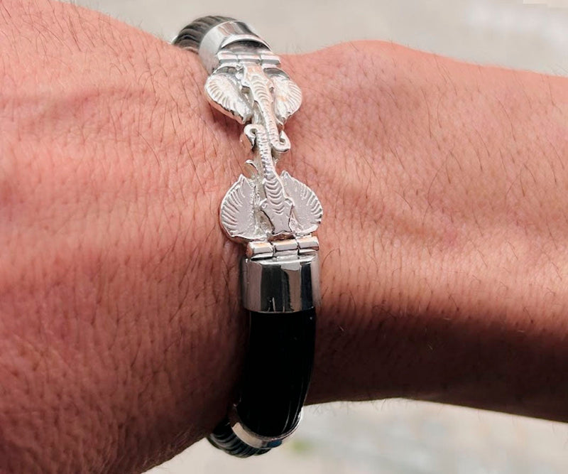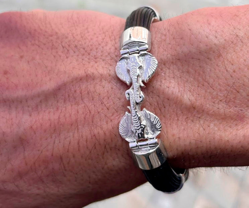 "Descubre la Pulsera Carril Doble con Cabeza de Elefante en Plata de Ley y Pelo de Búfalo Africano. Diseño unisex, ajustable y con envío gratuito. ¡Consíguela ahora!"
