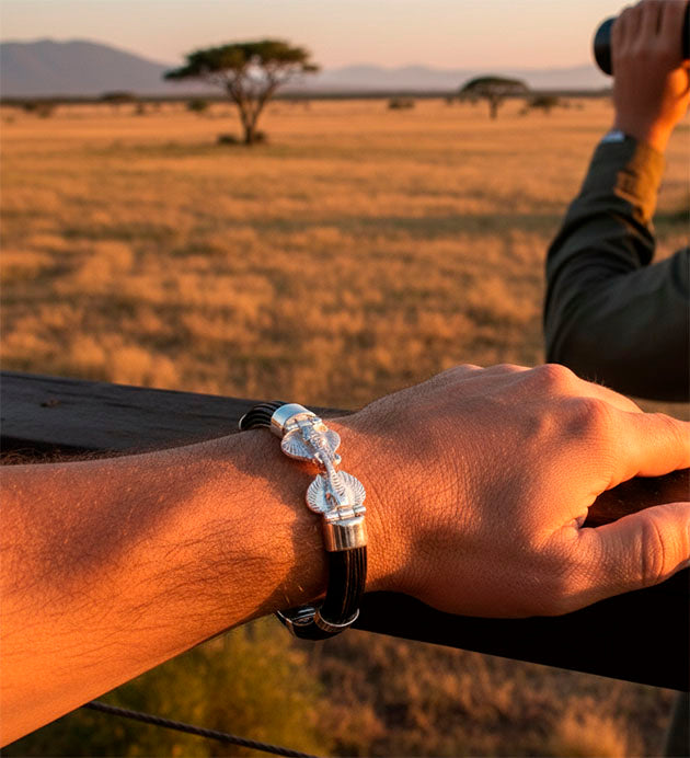 Luce un estilo único con la Pulsera Carril Doble con Cabeza de Elefante de Joyas de Caza, una pieza exclusiva que combina la majestuosidad de las cabezas de elefante en plata de ley (925 milésimas, 22 kilates) con el carácter natural del pelo de búfalo africano.